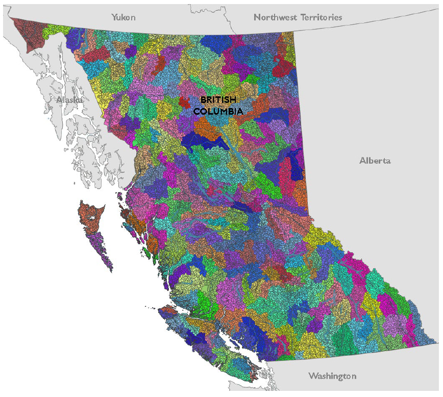 All Freshwater Atlas (FWA) Assessment Watersheds in BC (n = 19469). FWA Assessment Watershed are those adjoining features outlined in black. FWA assessment watersheds are defined at a 1:20,000 watershed scale and delineated with sizes between 2,000 to 10,000 hectares by the Province of BC and are the basis for the freshwater habitat status assessments described in this report. The larger colourings show the 246 FWA watershed groups in BC.