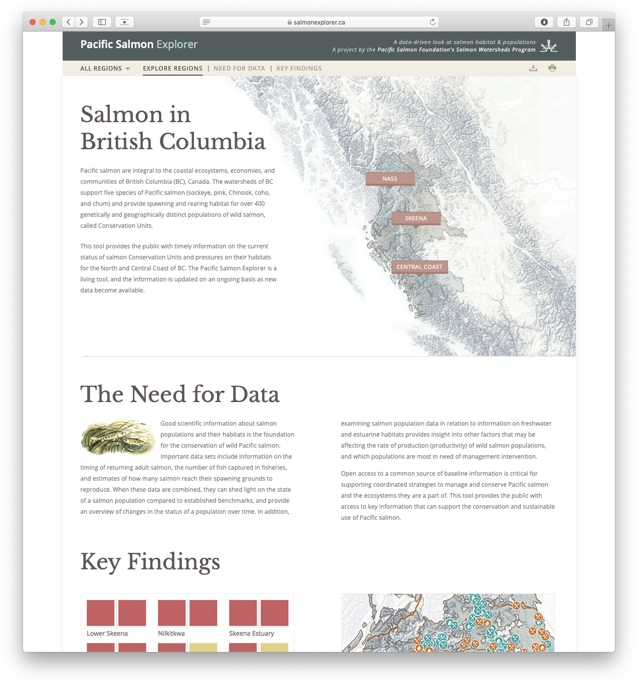 The Pacific Salmon Explorer is a novel online data visualization tool where information about salmon CUs and their habitats is freely and publicly available. The Pacific Salmon Explorer was built by Periscopic Inc. using HTML5 technologies and is driven by a PostgreSQL database developed and maintained by PSF staff. The Pacific Salmon Explorer was initially launched in June 2016, including only the Skeena Region. Since the Pacific Salmon Explorer was developed with extensibility in mind, we added additional Regions to the tool (see Section 5. Regions: Specific Data, Methods, and Results. We will continue to add additional Regions to the tool until all salmon CUs in BC and the Yukon are included.
