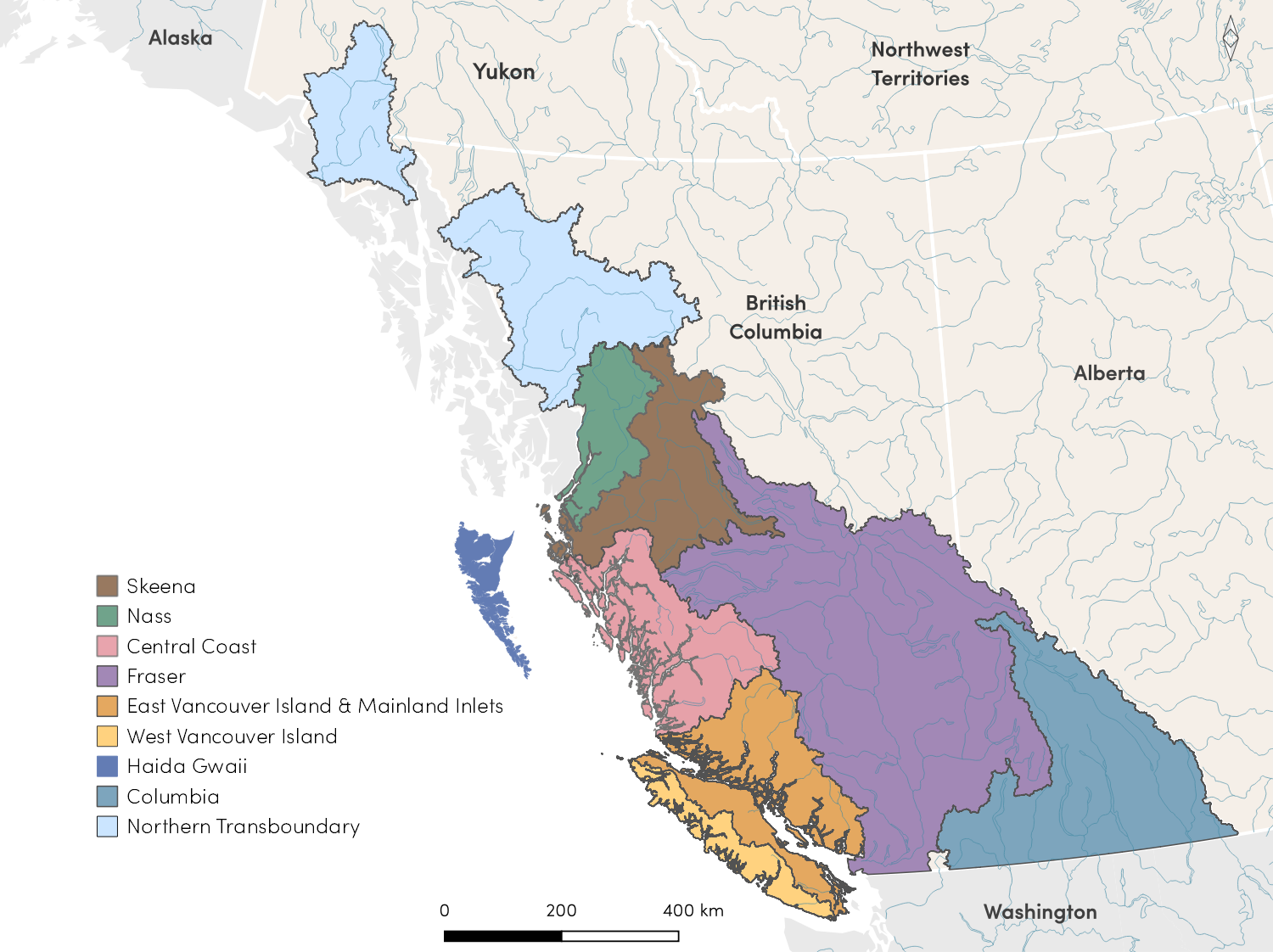 Our intent is to complete and maintain assessments of biological status and pressures on freshwater habitats across all salmon CUs in British Columbia and the Yukon. As of 2025, we have applied our approach to the nine major salmon-bearing Regions within BC (Skeena, Nass, Central Coast, Fraser, East Vancouver Island & Mainland Inlets, West Vancouver Island, Columbia, Haida Gwaii, and Northern Transboundary Regions). In the near future, we aim to apply our approach to the salmon-bearing watersheds within the Yukon Territory.